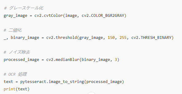 ・二値化:画像を白黒に変換して、文字の認識精度を高めます。